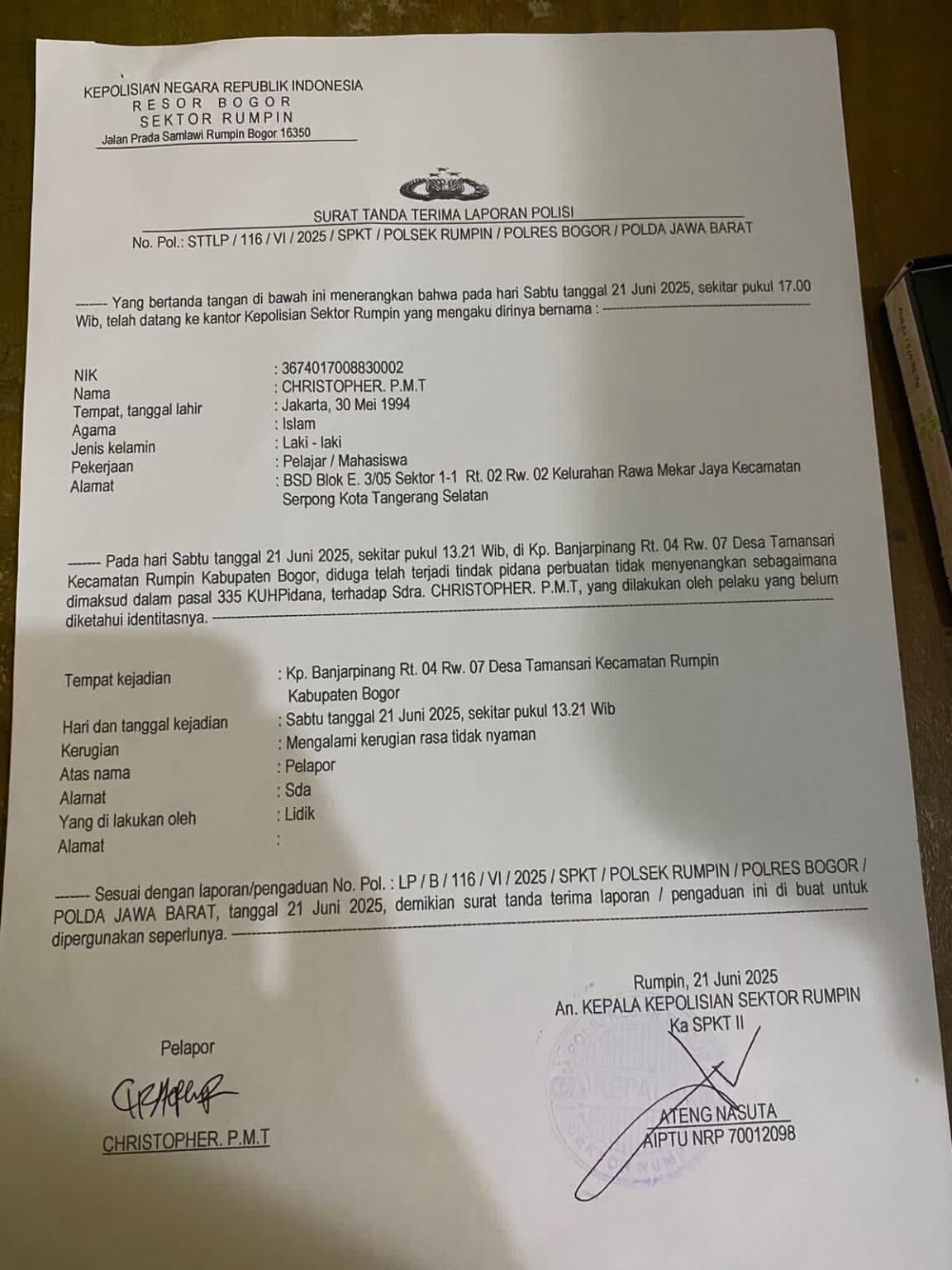 Tim jurnalis telah melaporkan insiden tersebut ke Polsek Rumpin guna mendapatkan perlindungan hukum dan meminta agar aparat penegak hukum menindaklanjuti kasus ini sesuai ketentuan yang berlaku.